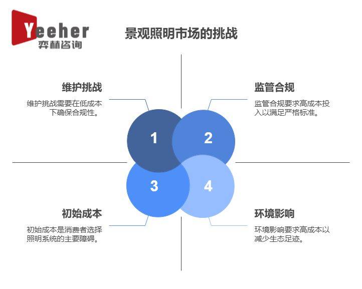 景观照明市场面临着越来越大的压力,需要遵守严格的监管和环境标准。政府和监管机构要求照明产品具有能源效率和可持续性。这些规定影响设计和制造过程,要求公司投资研发以满足合规要求。关键挑战包括: