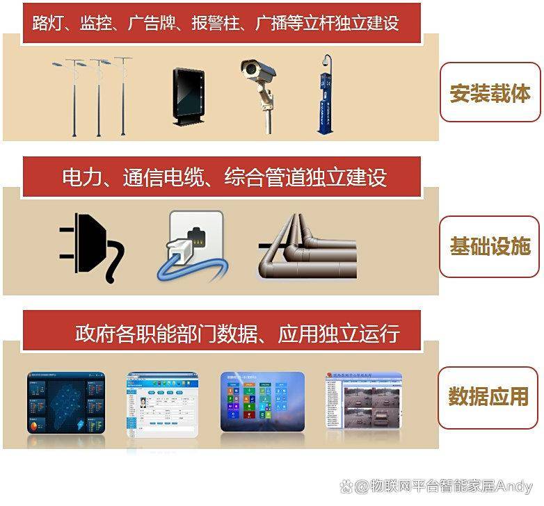 市政工程庞大臃肿,重复建设率高,反映出当前的城市管理水平不高,市政建设的成本高、周期长,资源浪费,造成信息孤岛。路灯、监控、广告牌、报警柱、广播等立杆独立建设;电力、通信电缆、综合管道独立建设;政府各职能部门数据、应用独立运行。